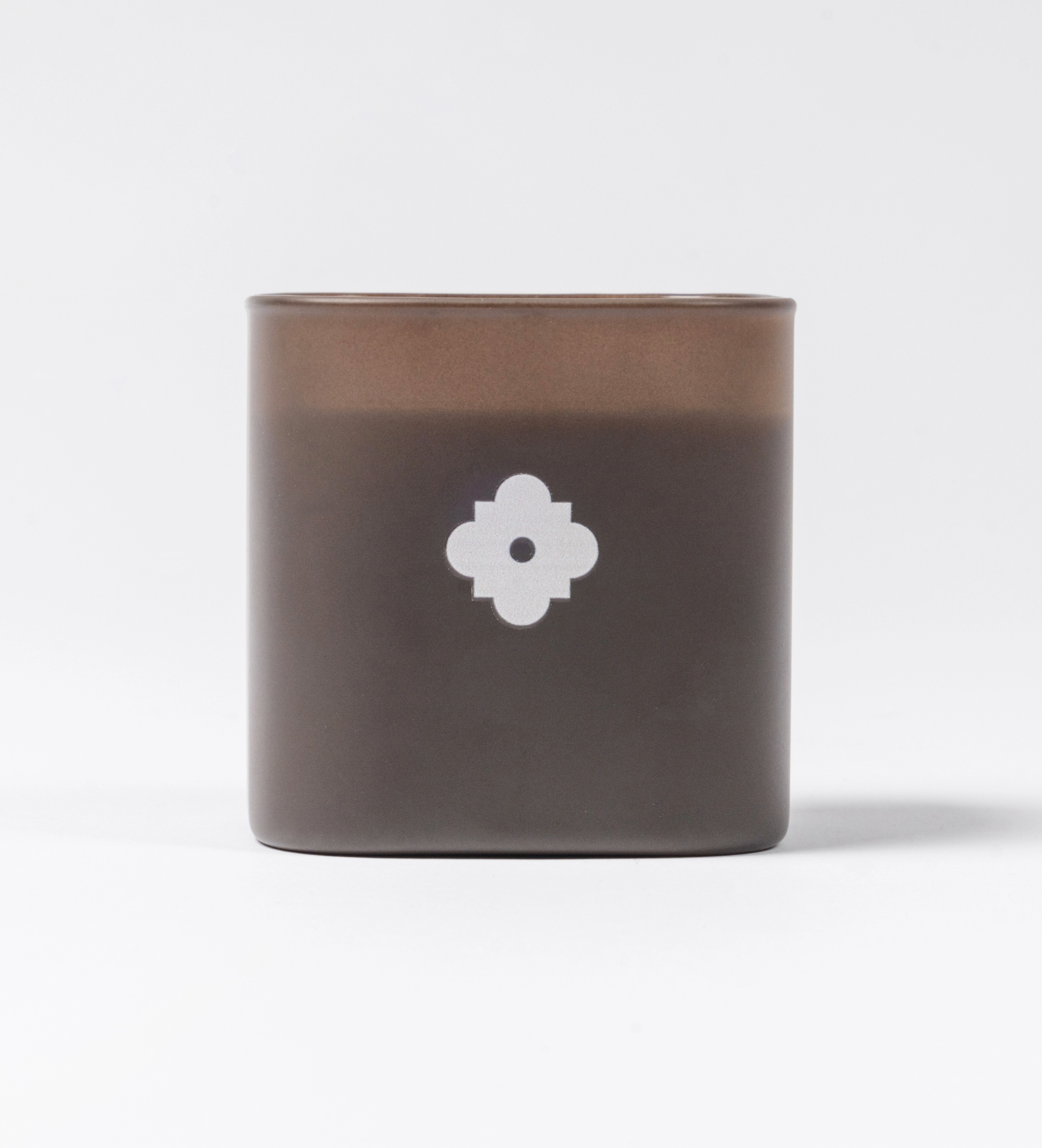 ARLO scented candle in brown glass – back view with white flower emblem, luxury home fragrance